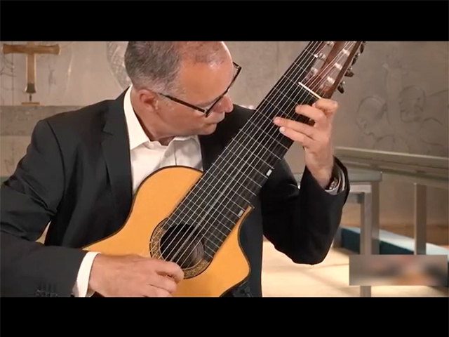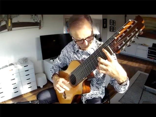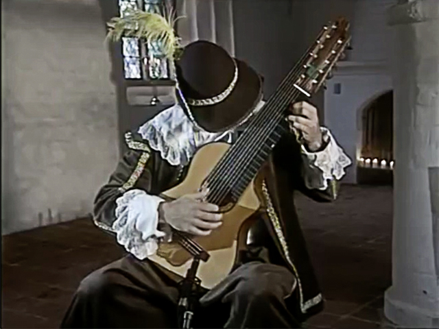 The musician showcases his skills on both a six-string classical guitar and an eleven-string altoguitar, a popular instrument from the Renaissance and Baroque periods.
