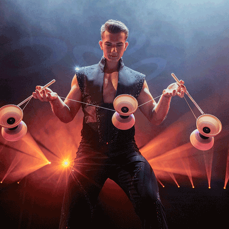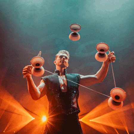Juggling up to four diabolos on the rope simultaneously, his shows are both fun and dynamic. This charismatic performer is certain to captivate audiences at every performance.