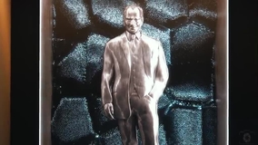 This sophisticated hologram is displayed on a 5-meter-tall LED canvas and features 10,000 kinetic metal pieces.