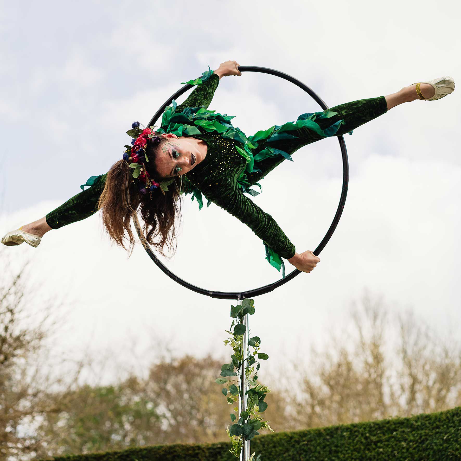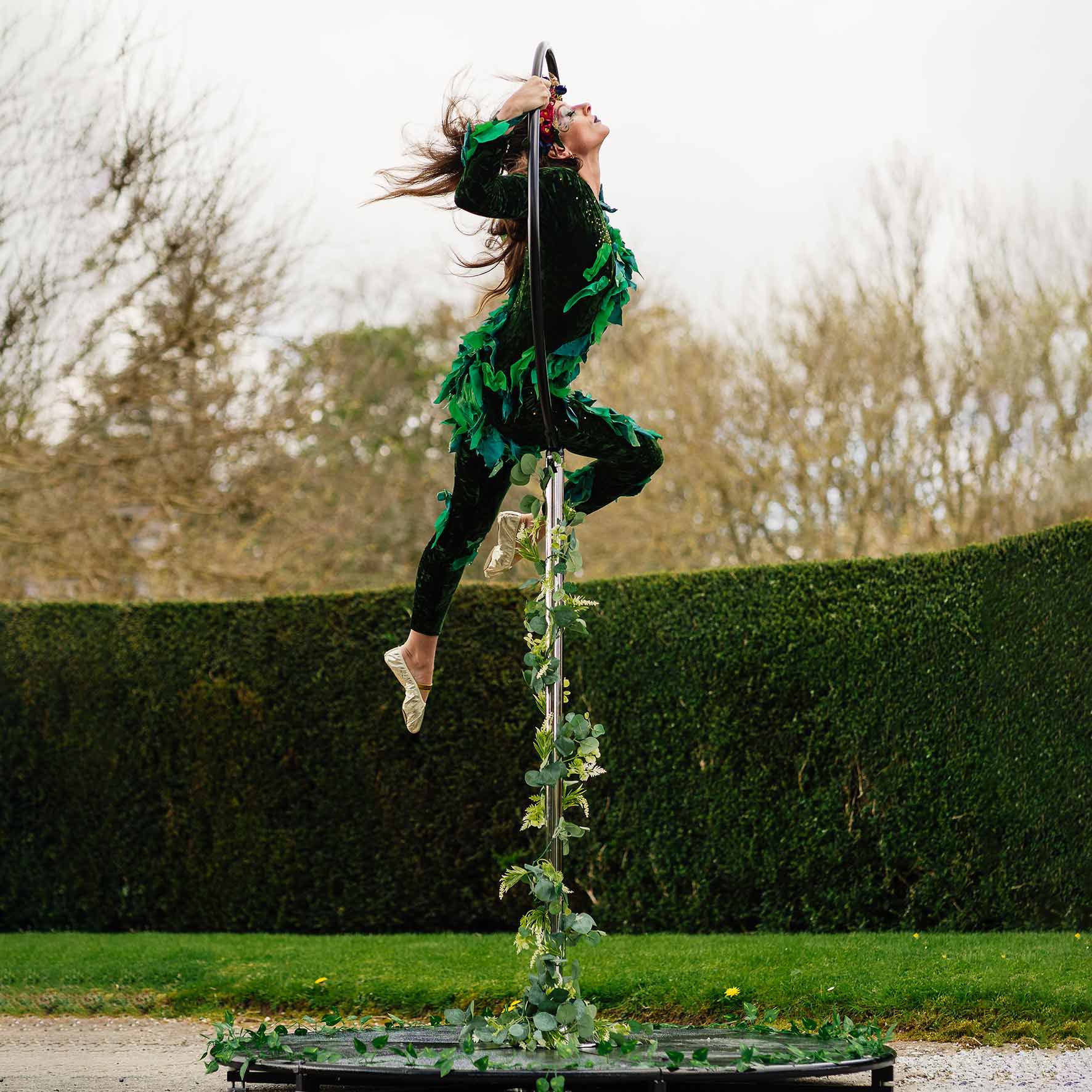 The lineup can feature a garden goddess, acrobatic owls, roaming fauns, a living tree, floral hostesses, and an impressive aerial hoop artist.