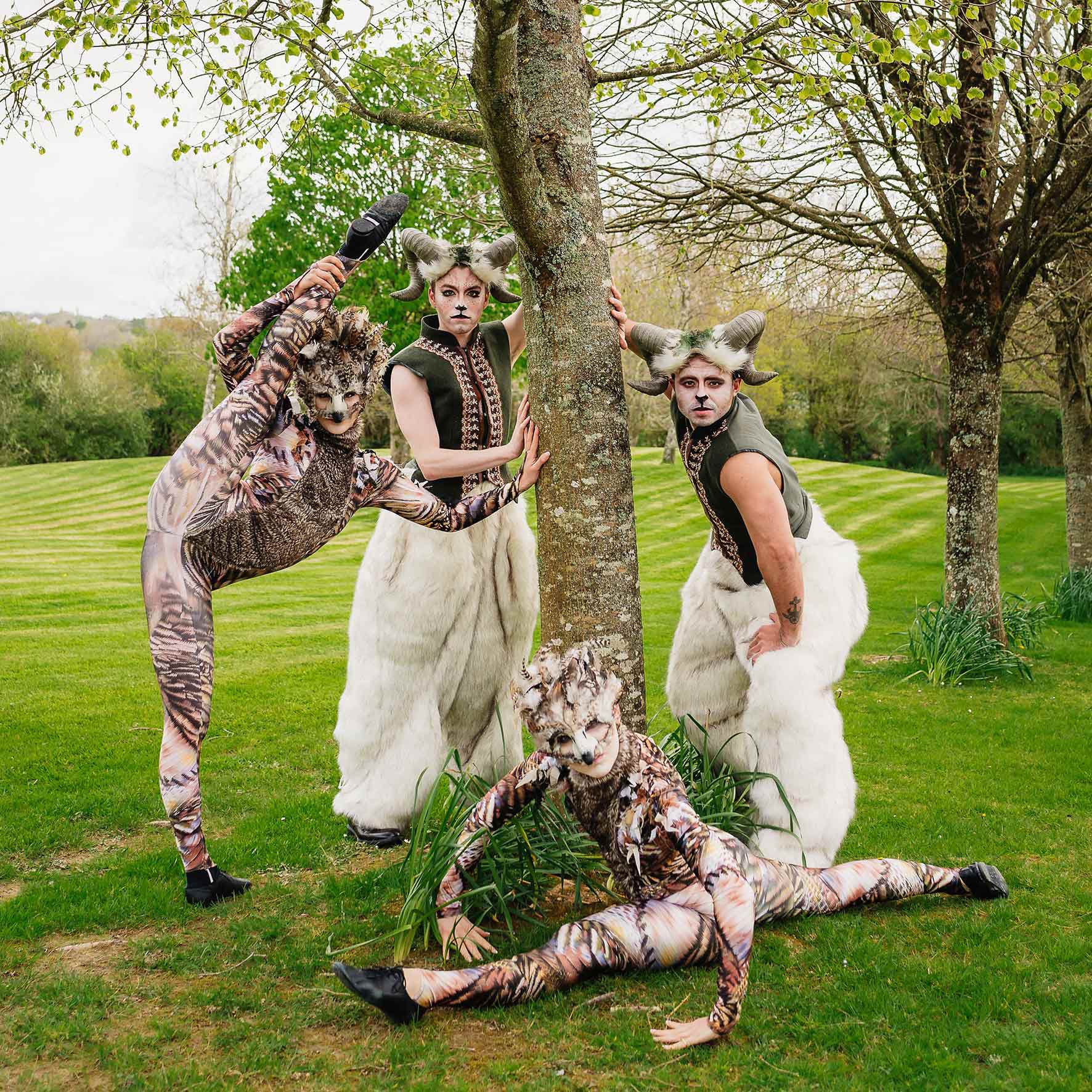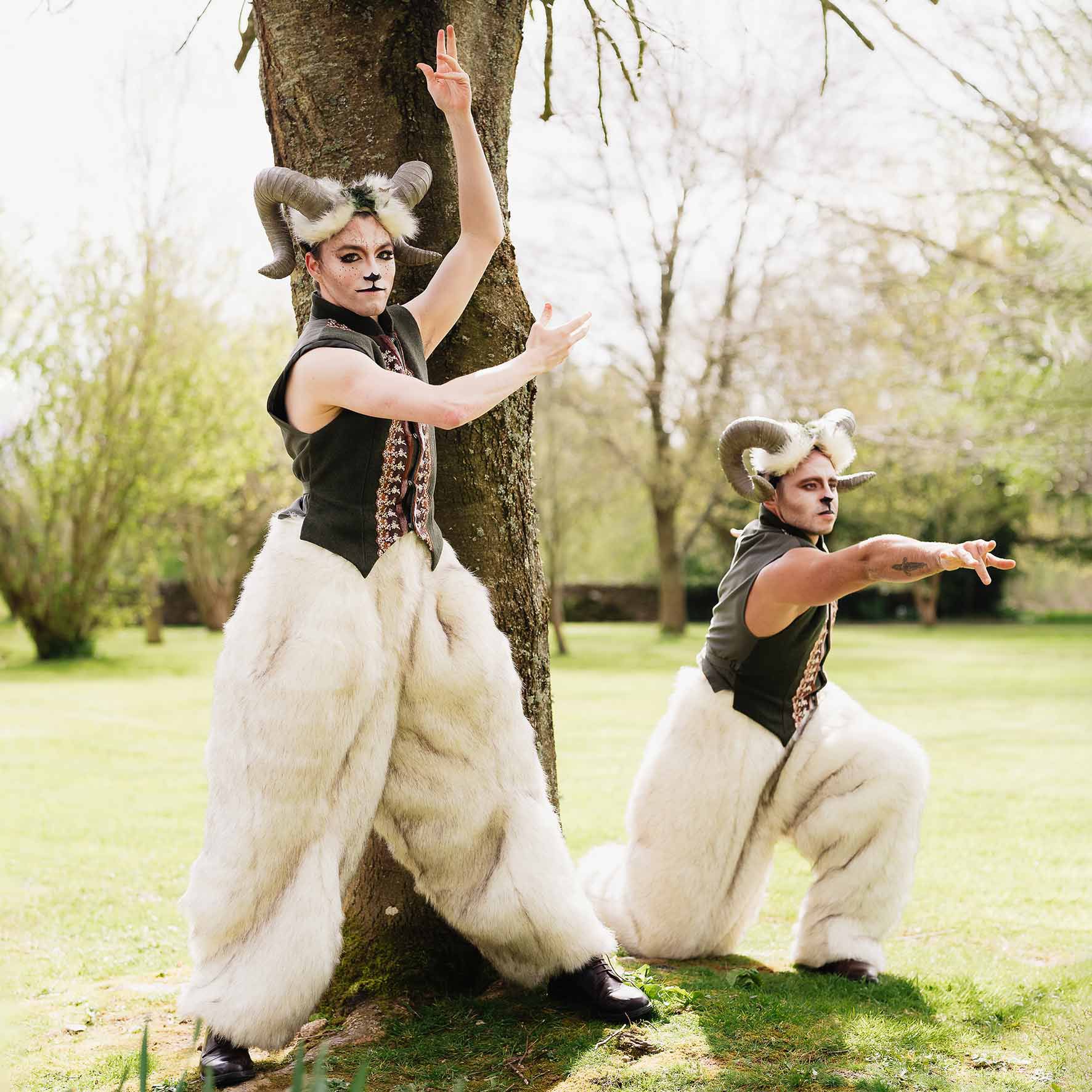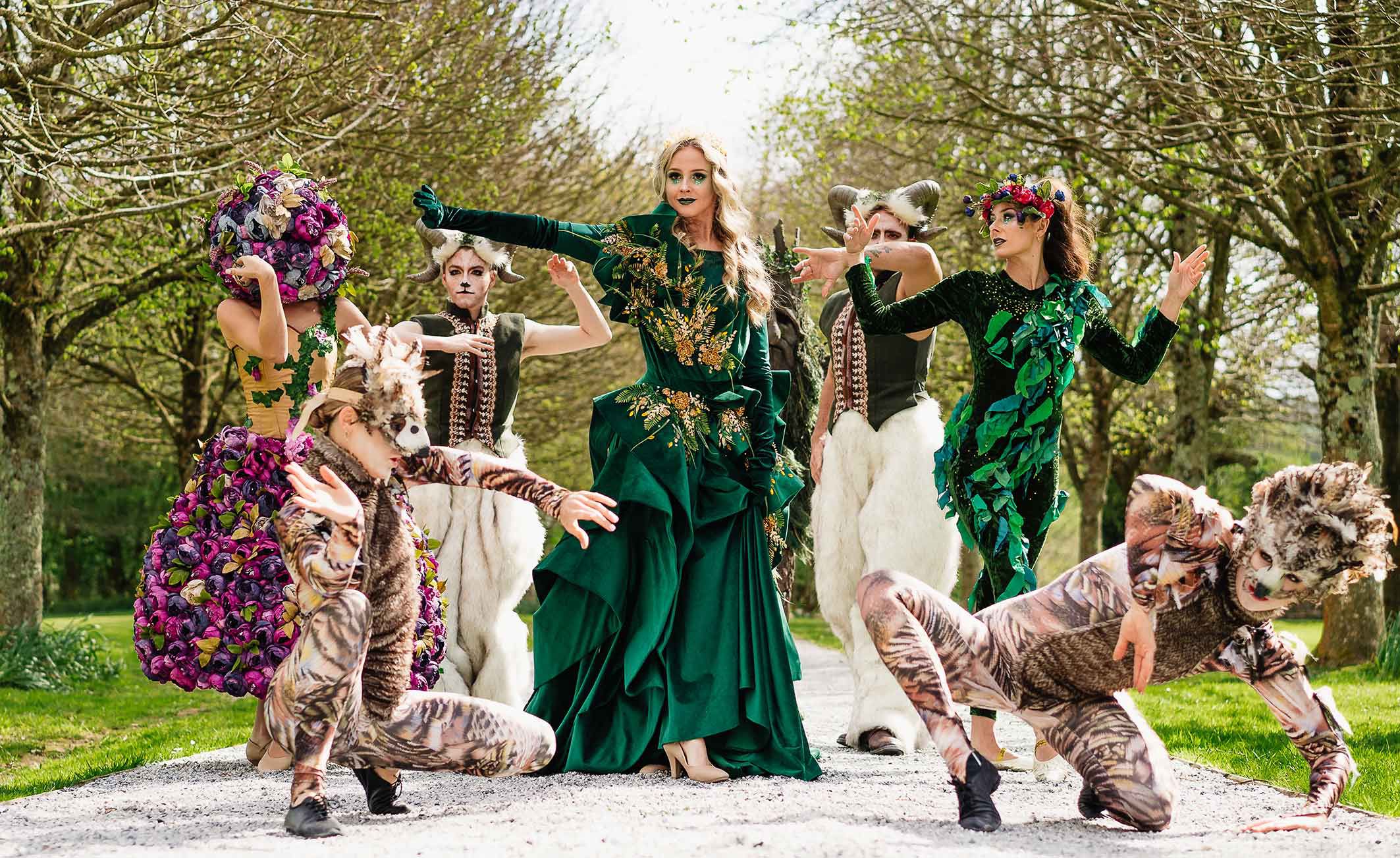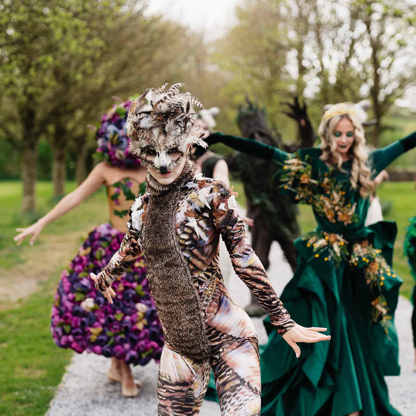 Our exceptional performers, adorned in breathtaking woodland-themed attire, can offer roaming sets, choreographed pop-up shows, or be booked as a parade.
