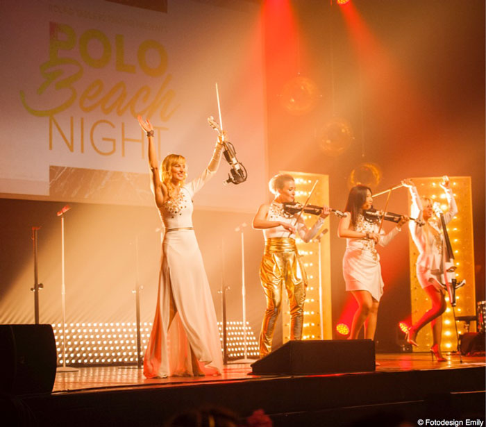 Whether taking center stage or providing background music, the female string quartet wears specially designed attire by renowned designer Nicky Vankets. From the opening number to the grand finale, the Exclusive Electric String Quartet captivates the audience with an infectious blend of classical and pop instrumentals. Their high-tech strings create a contemporary sound, and their wireless performance style encourages interaction with the audience.