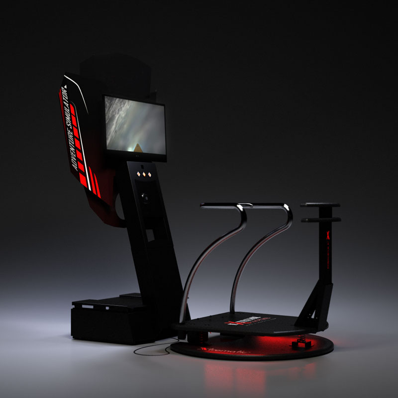 A virtual simulator with an Oculus headset provides extreme sensations through a 360-degree view of the virtual environment without any risk. This digital experience is enhanced by an interactive vibrating platform that reacts to body position, allowing players to control the game.