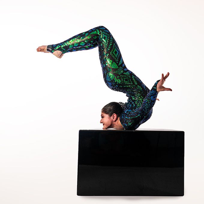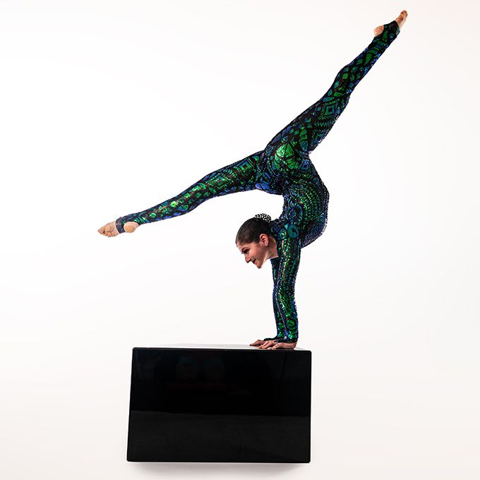 A highly acclaimed female contortionist known for her fluid routines delivers captivating, one-of-a-kind performances on a spinning cube!
