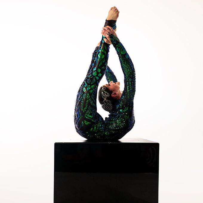 Shows feature incredible shapes and twists, including the renowned and astonishing Marinelli bend, which she executes effortlessly.