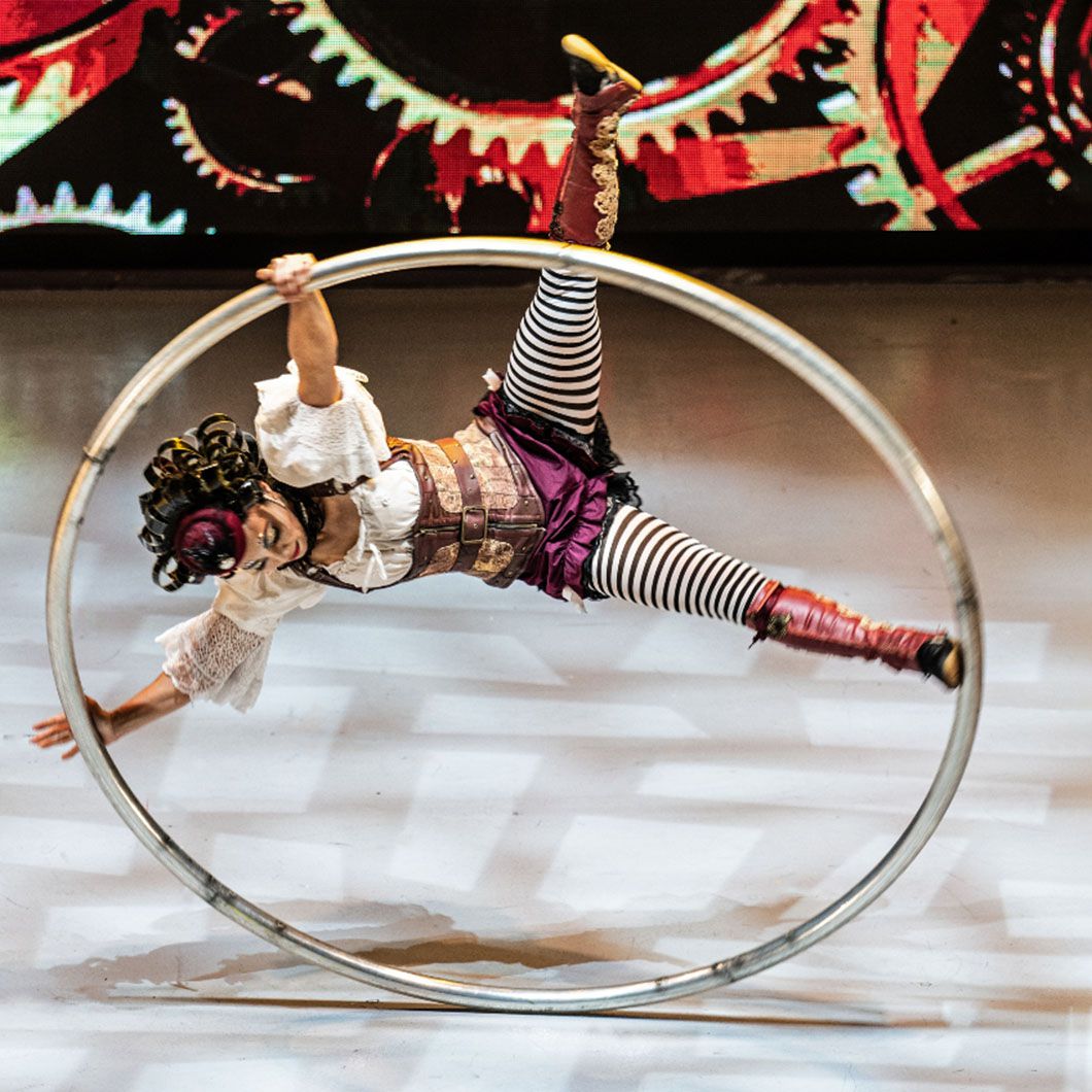Let your guests be mesmerized by the enchanting movement of the Cyr Wheel in this spellbinding choreography.