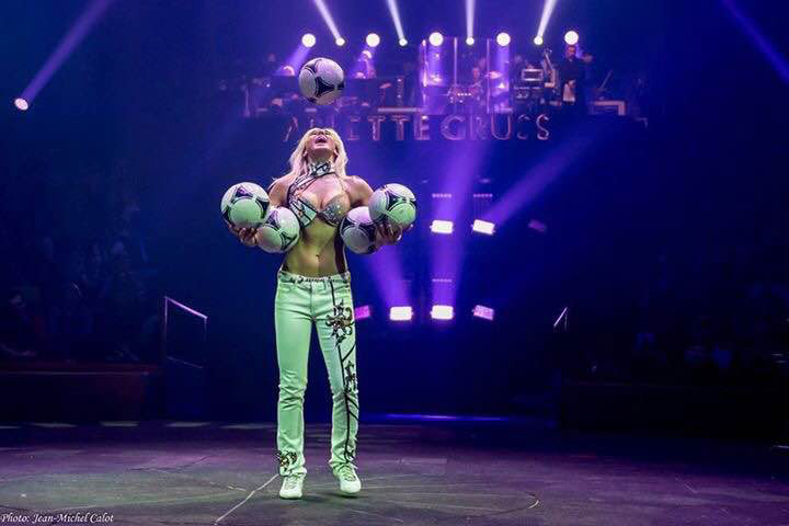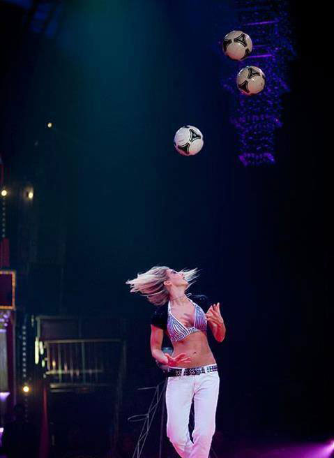 A football juggling act that can balance footballs on her head.