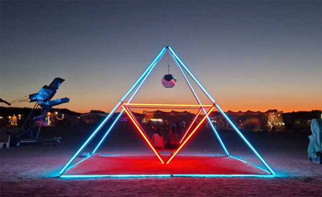 Our Festival LED Pyramid measures 6m x 6m with a height of 4.3m. This impressive installation has been showcased at numerous festivals, including the renowned Burning Man!