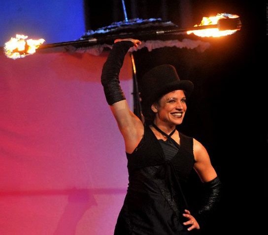 When the artist steps behind the screen, a delightful costume transformation often occurs, along with a change in music! Then, in a stunning climax, the artist delivers a pyroelectric or dramatic fire-spinning finale!
