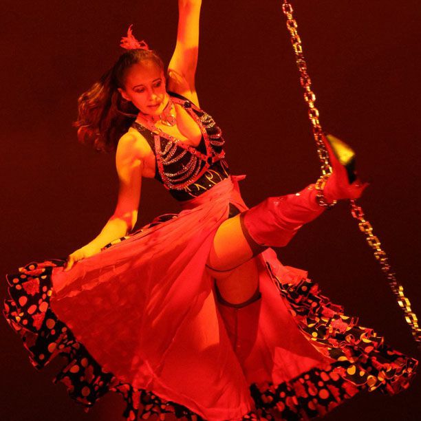 An award-winning aerial chains performer presenting a distinctive Flamenco-themed spectacle