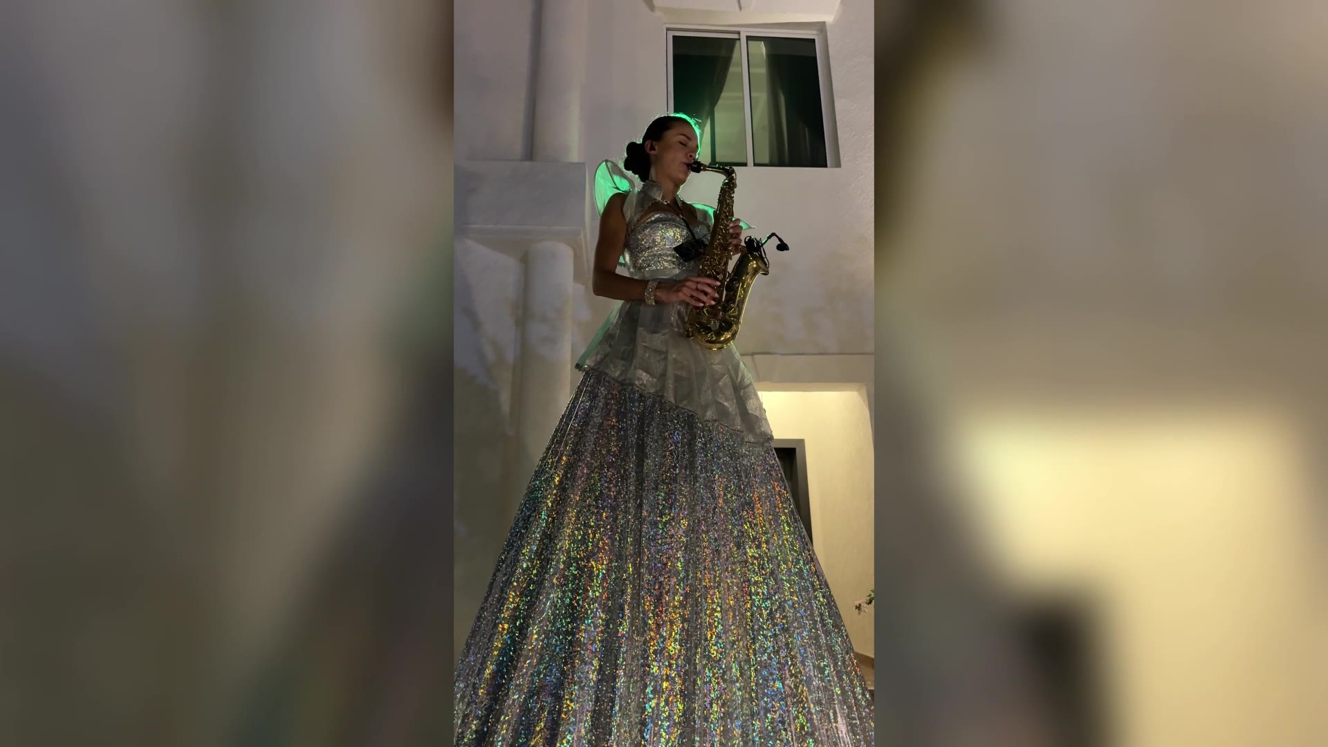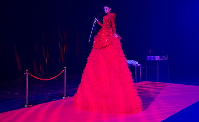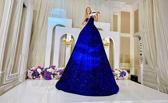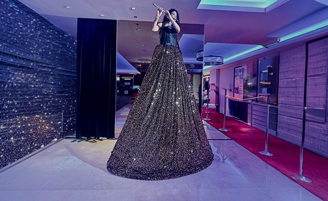 Striking, elevated performance featuring a musician in a couture-style gown, creating a powerful visual centre piece and instant wow factor