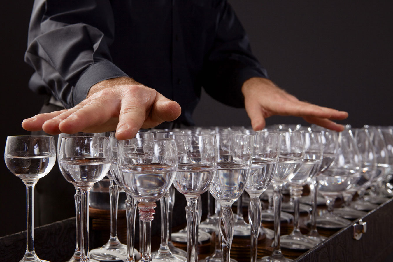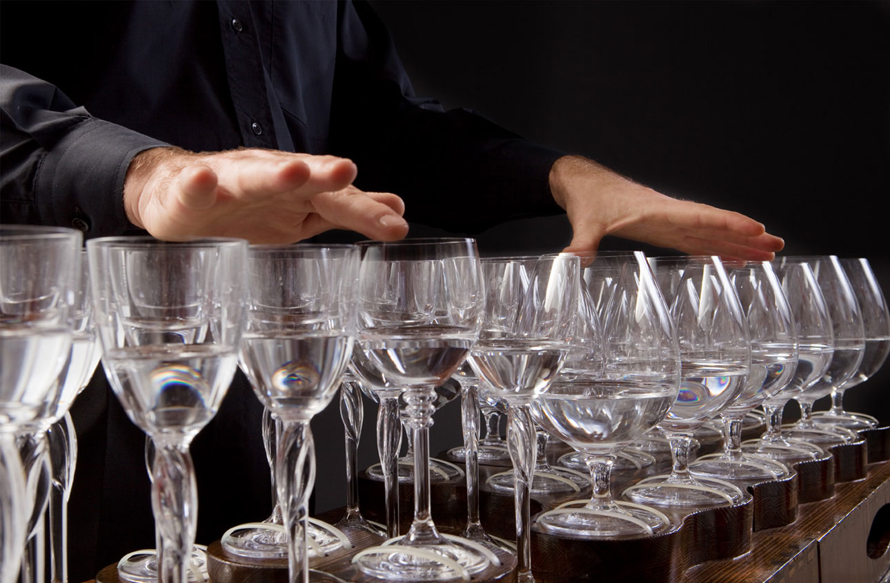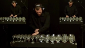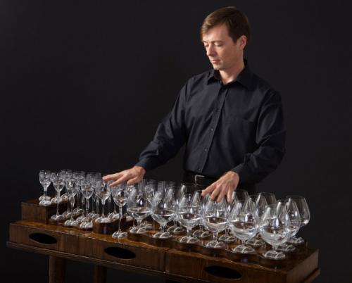 Turning a set of stemmed wine glasses into a magical musical instrument, Robert meticulously tunes each glass by adding just the right amount of water. Then, using only his fingertips, he skillfully moves from one glass to another, producing diverse sounds.