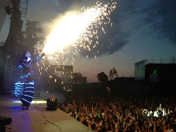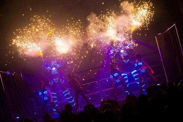 Adorned in remotely controlled, color-changing LED lights that highlight their spectacular futuristic costumes, and equipped with CO2 canons and twin pyrotechnic guns designed to amaze your audience, our mesmerizing LED act will literally dazzle at your event.