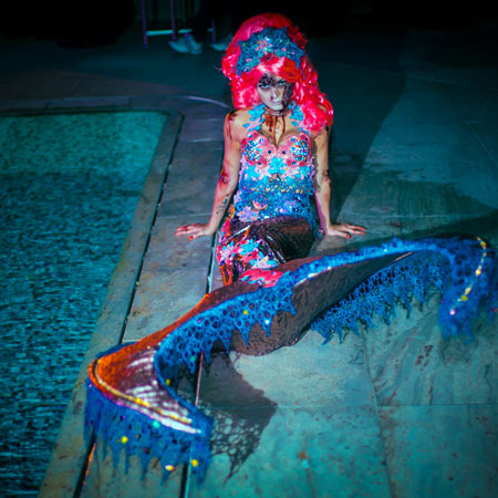 The costumed performer brings an aura of class and elegance to any themed event with her shiny, sparkly vibrant costume and gory face paint. She can make appearances indoors, outdoors by a body of water, or even far from water. Her versatility and adaptability make her perfect for any setting. Wherever you choose to place the Halloween mermaid, she will become the center of attention and provide outstanding interactive entertainment.