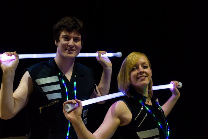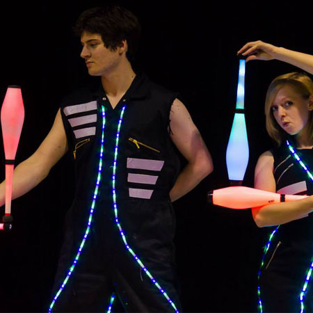 Starting with a single club each, our circus jugglers climax their routine by juggling 8 clubs between them. Both professionally trained circus entertainers, the performers in our juggling act are also skilled aerialists, acrobats, and fire artists. Capable of using traditional juggling clubs or illuminated LED sticks, this act is perfect for both daytime and nighttime events.