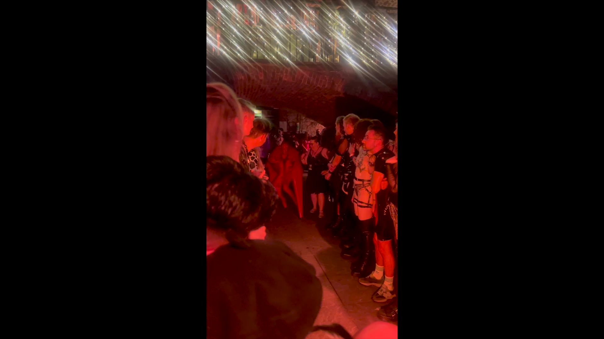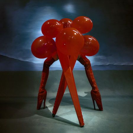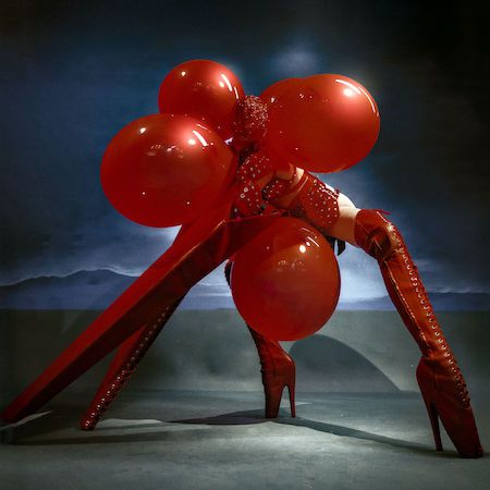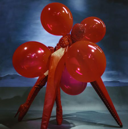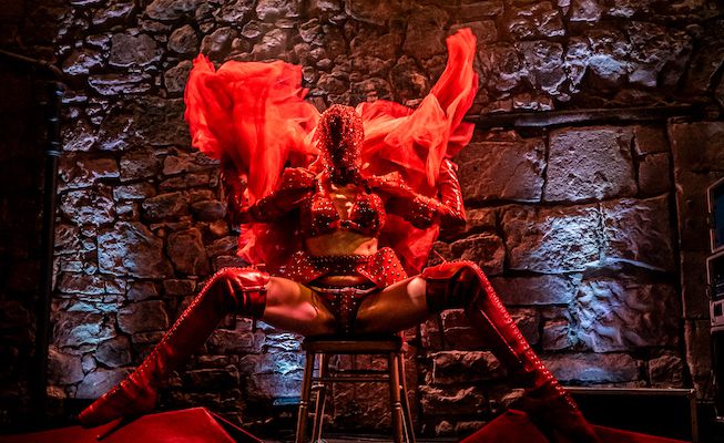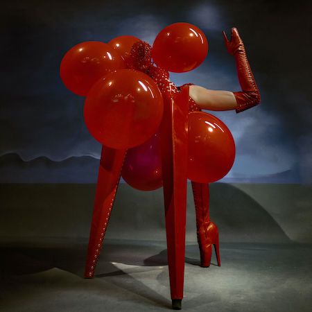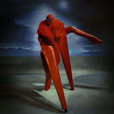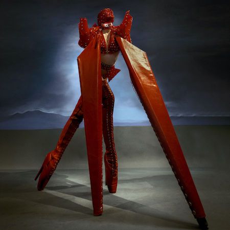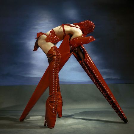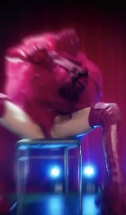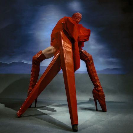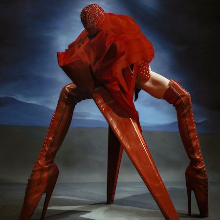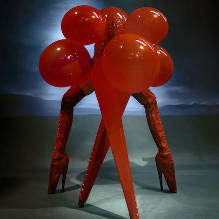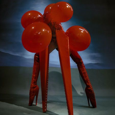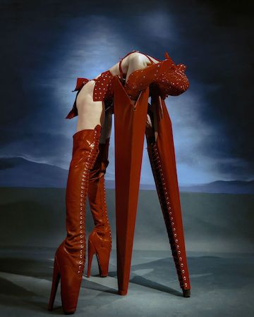 This striking red four-legged creature presents a bold burlesque-inspired act, blending fashion, fetish influences, and conceptual performance
