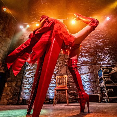 Guided by her handler and adorned with red crystals, leather boots, and PVC, she performs a stylised striptease, with optional balloon elements