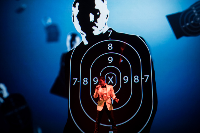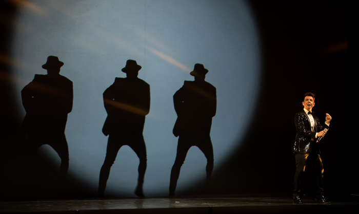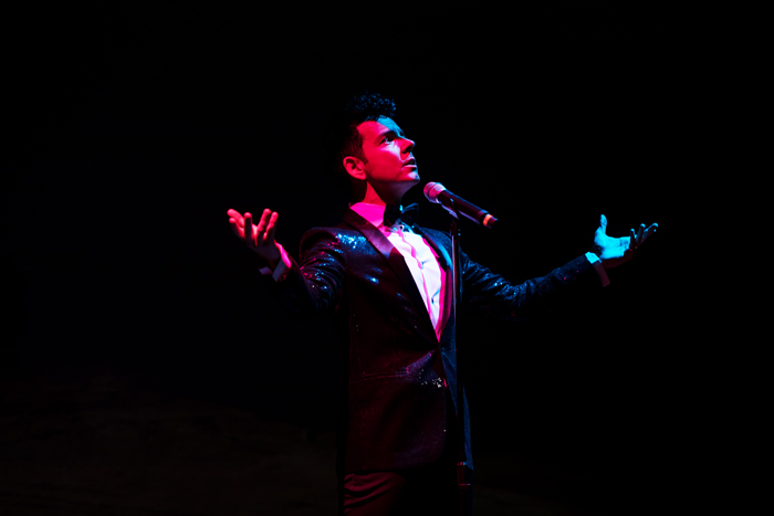 Focusing on the exceptional talents of the male singer, this thrilling musical multimedia show features high-quality backing tracks. The show comes alive with captivating video content projected onto a screen behind him, with custom-made video elements that the cover singer interacts with, akin to a video mapping performer.