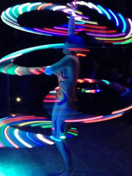 A fantastic and stunning hula hoop act featuring our talented hula hooper and costumed performer, she is a whimsical and delightful presence that will steal the show with her enchanting smile, fast-paced nature, and graceful performance. Her live show is certain to leave your guests with unforgettable memories and lasting impressions, making her the star of your event for weeks to come. Dazzle your guests with our LED hoops as our performer illuminates your special occasion or social gathering with a vibrant array of colors.