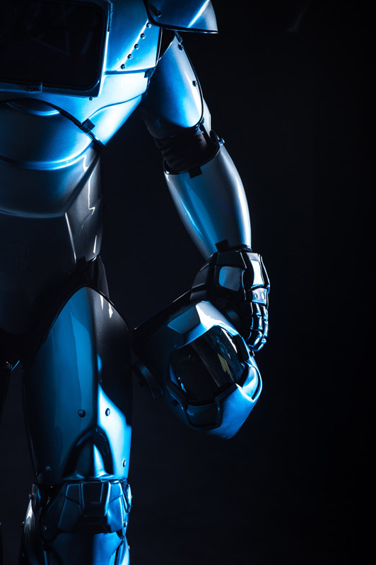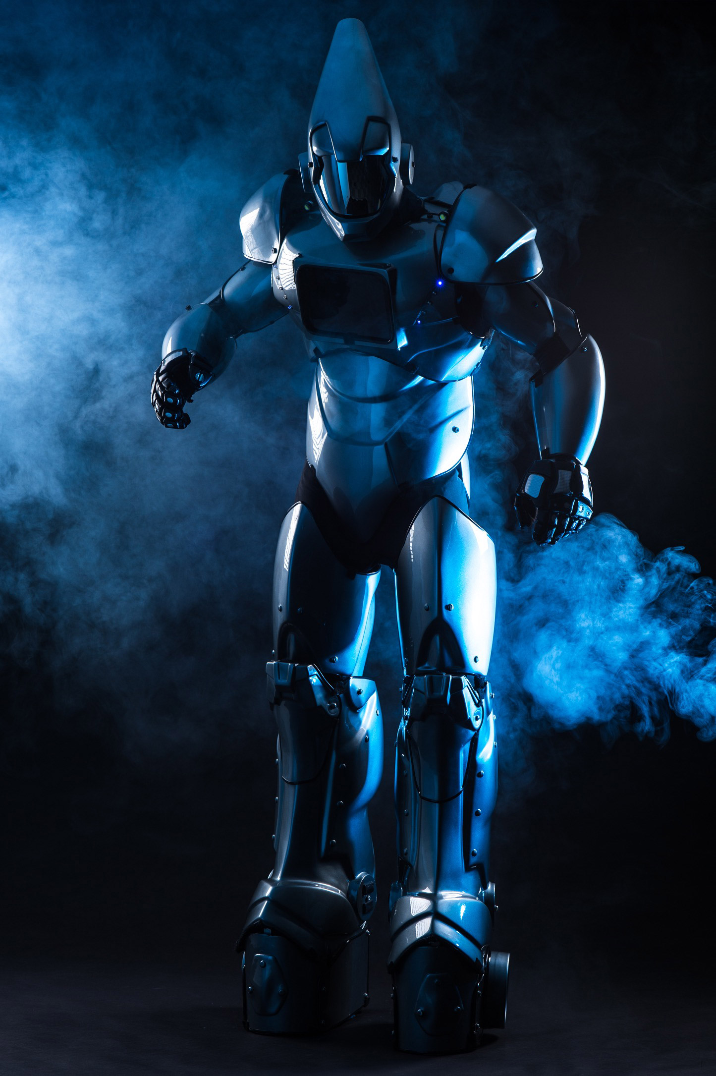Features an interactive chest-mounted iPad, camera, and music visualizer