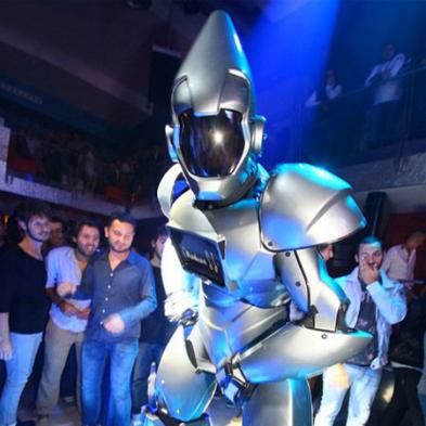 I-Robot stands out as a unique attraction and the first artist featuring lifelike robotic qualities! Standing at 2.5 meters, he navigates among the audience or on the dance floor, performing with light, sound, and pyro effects.