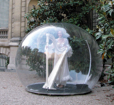 Her repertoire includes both Celtic and pop music, along with original arrangements of jazz standards, swing music, and other styles. Beyond that, she creates her own compositions and has toured France and Italy, captivating audiences with her unconventional and creative pieces. For a stunning visual element at your celebration, she can perform with her LED harp inside giant LED cubes or bubbles, as seen in the pictures above.