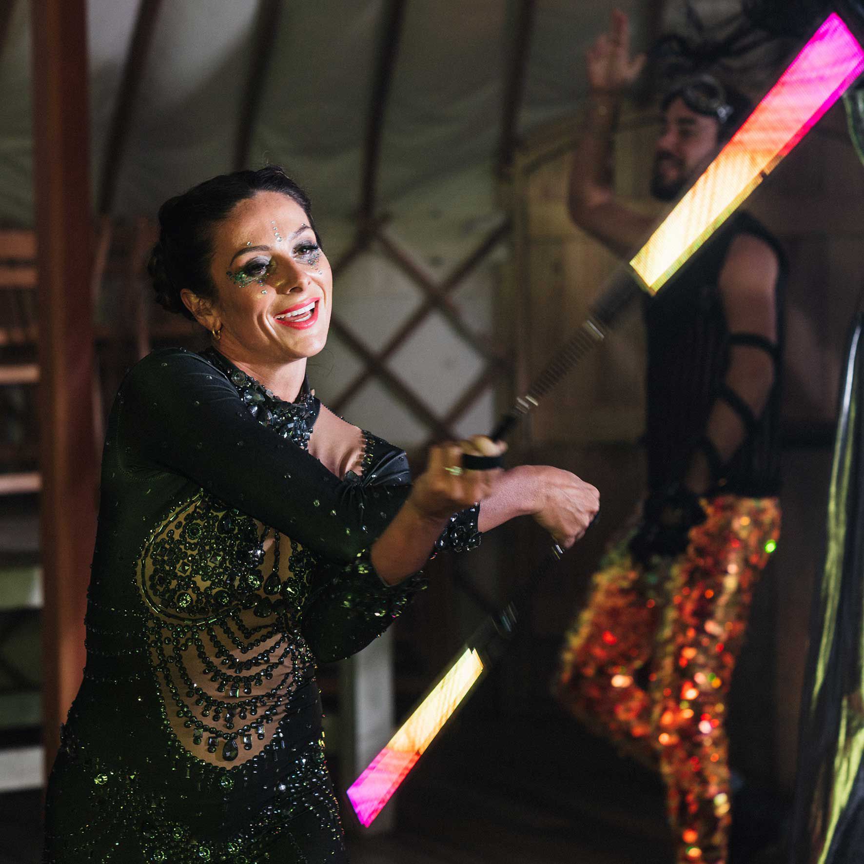 Our customizable LED poi performers are available for solo or duo mix and mingle acts, stage shows, or as part of an expansive cirque production.