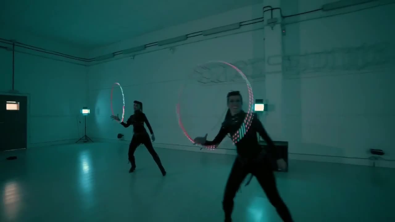 Our dazzling LED poi spinners are masters of the traditional circus arts of poi spinning and hula hoop performances. By outfitting the poi and hula hoops with multicolored LED lights, the act is given a modern twist, resulting in a striking visual performance. Our four enchanting LED performers deliver a mesmerizing routine where their swift, intricate moves and the vivid colors of their LED lights and costumes blend against a dark backdrop to beautiful and hypnotic effect.