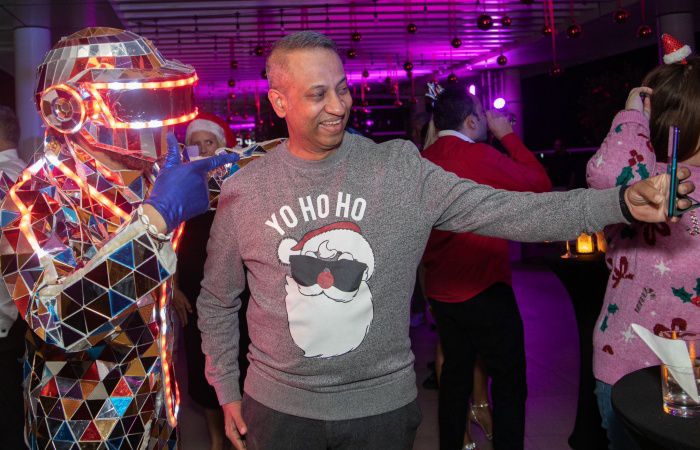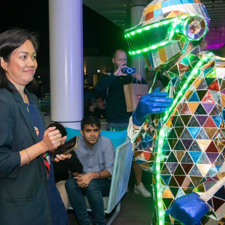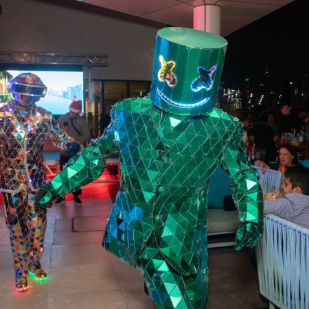 Choose from LED robots, mirror costumes, or marshmallow heads, available as stilt walkers or roaming ground characters.