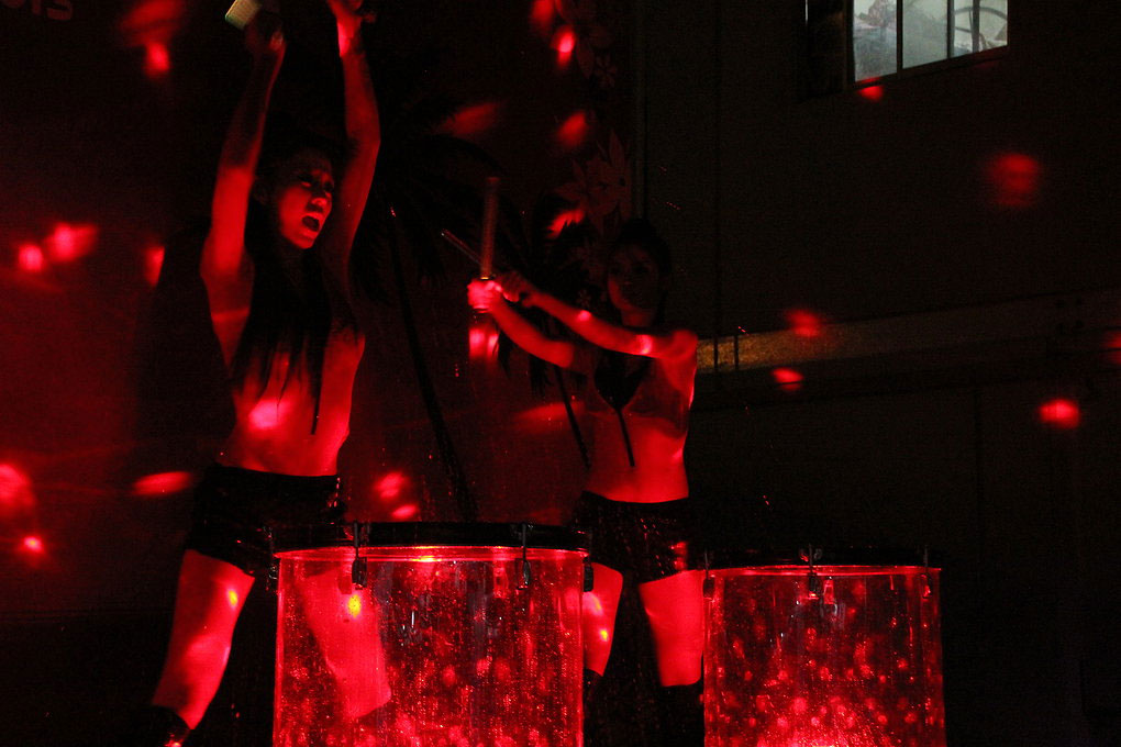 Choreographed performances on water drums, rolling drums, and LED drums