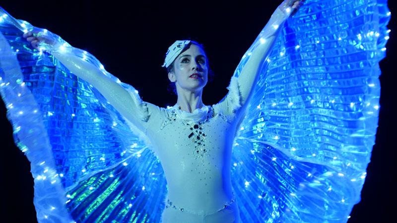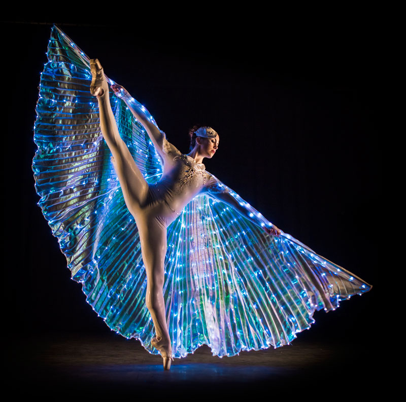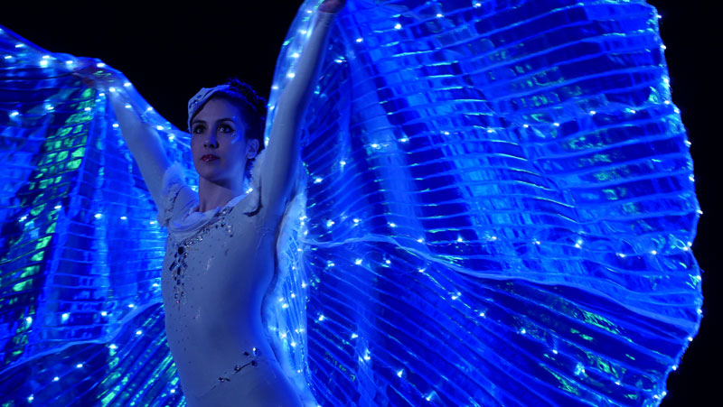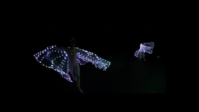 These dancers merge dazzling light visuals with captivating choreography on ballet pointe. Watch as their large, spiraling wings form enchanting patterns in perfect harmony. Creating geometric illusions with their expansive wing spans, our ballet dancers glide gracefully across the stage.