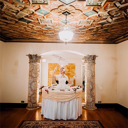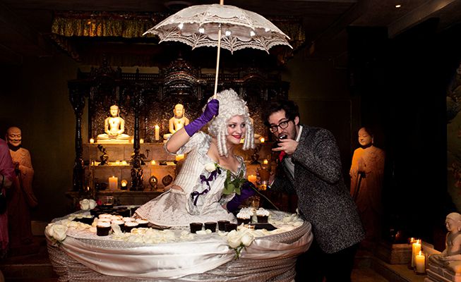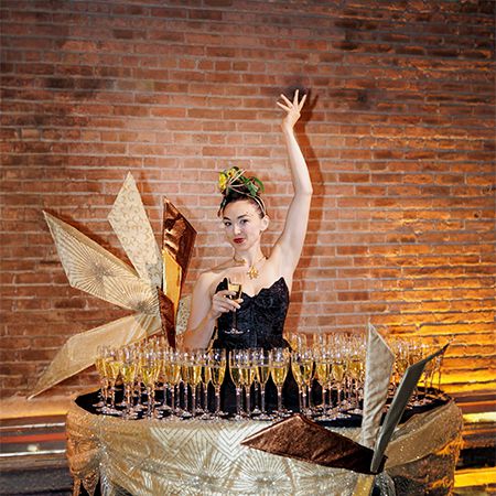 Guests are captivated as elegant performers wear hoop skirts that double as moving tables, serving appetizers while enhancing the event’s ambiance
