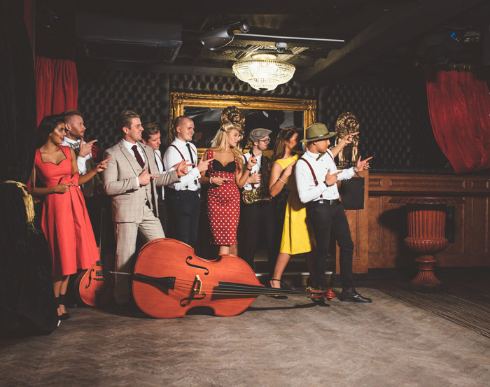 A standard line-up for our London Retro Modern Swing Band is a six-piece fronted by a male vocalist. There are options to add female singers and a brass section to enhance the performance. They have a wonderful repertoire that can cater to all tastes, and they will even learn songs for clients and give them the vintage treatment.