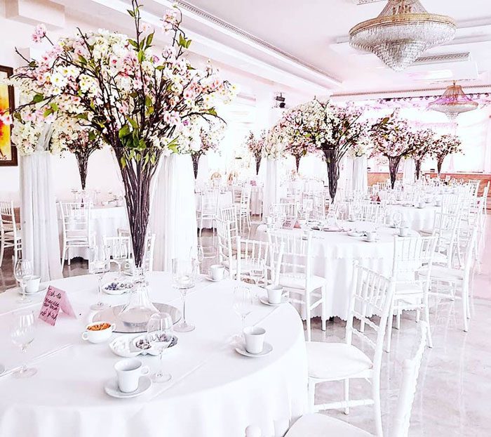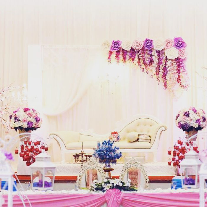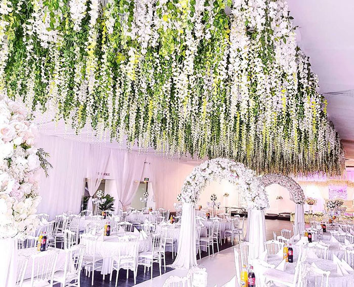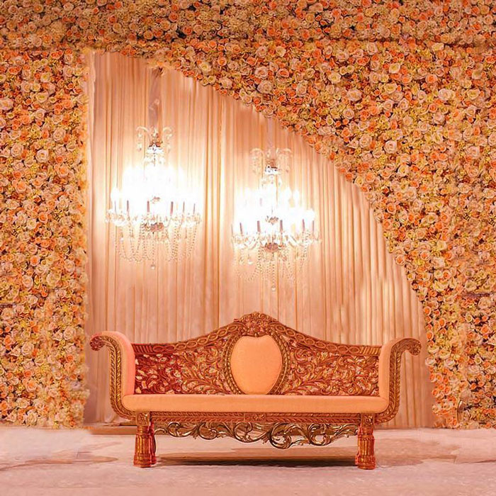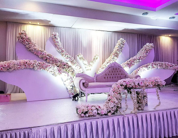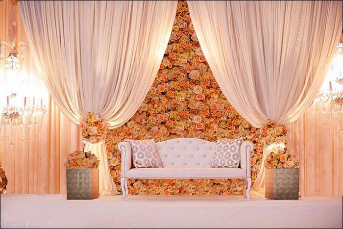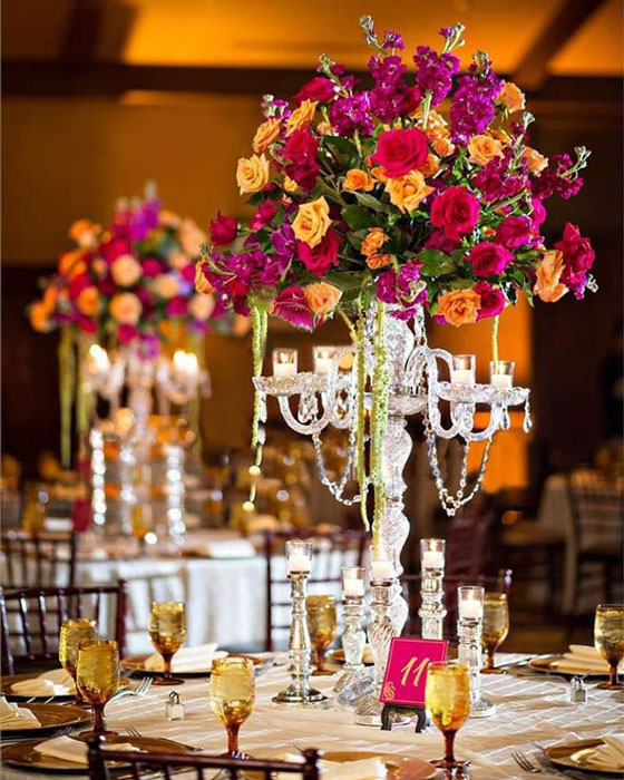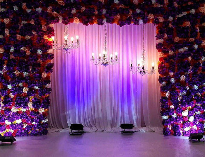 Flower walls, chandeliers, table centerpieces, ornate set designs, floral curtains, and much more