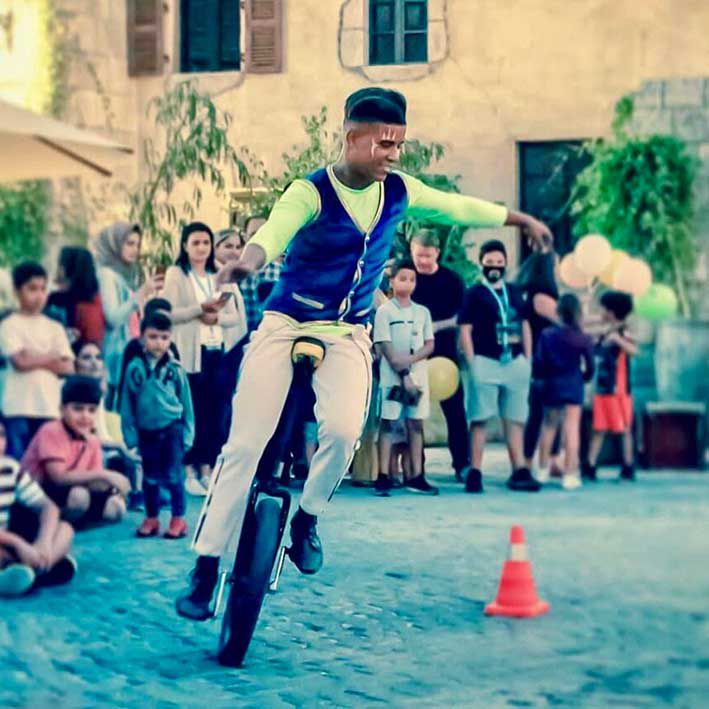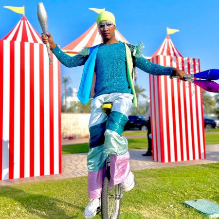 Friendly and approachable, he captivates audiences with his unicycle juggling skills, gracefully weaving through the crowds.