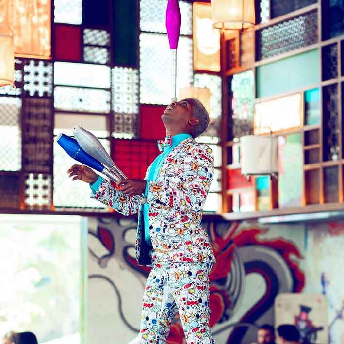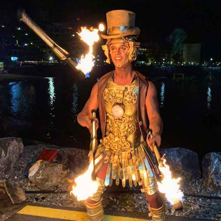 Our exceptionally versatile circus performer provides an impressive array of ambient and roaming cirque displays, featuring juggling and fire acts.