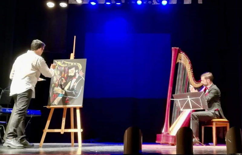 The artist offers both solo and group performances, frequently sharing the stage with live musicians, dancers, and speed painters.