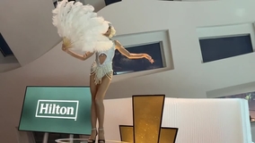 Book this impressive martini glass featuring a glamorous dancer to greet guests and pose for memorable photos, ideal for sharing on social media.