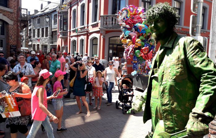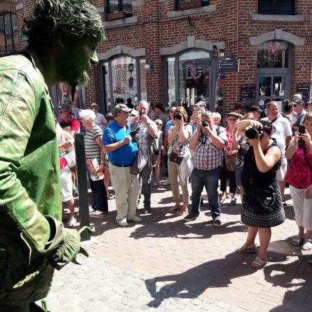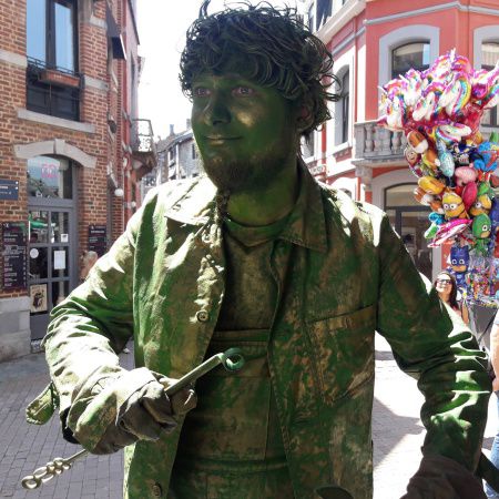 Dressed and painted in opulent green and gold, he gives the illusion of a real statue and is certain to captivate both children and adults.