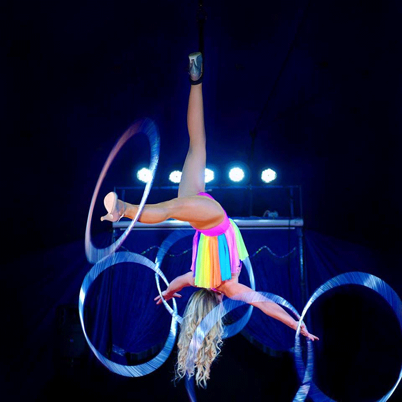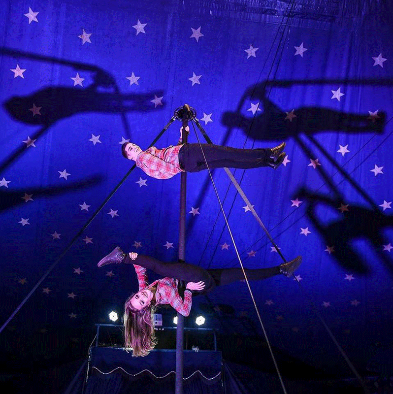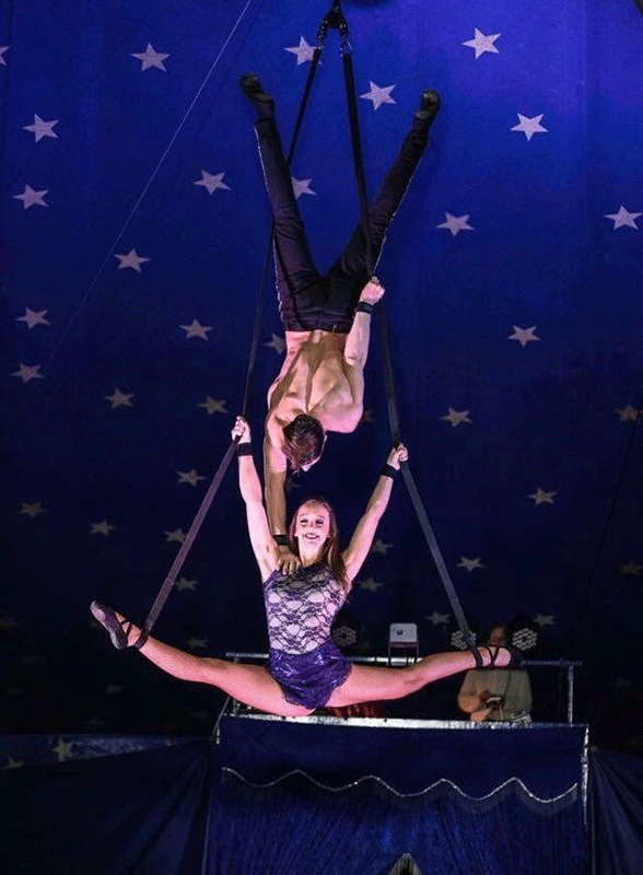 Versatile duo specialize in straps, cyr wheel, hula hoop, Chinese pole, tight-wire, and much more.