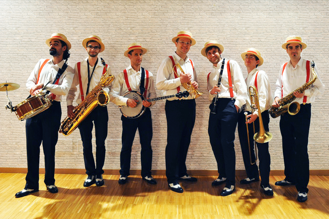 A talented ensemble, the group features Marco on the baritone saxophone, Matteo on the tenor saxophone, Lorenzo on the piano and banjo, Alessio on the trumpet and vocals, Demetrio on the trombone, David on the clarinet, and last but certainly not least, Thomas on percussion!