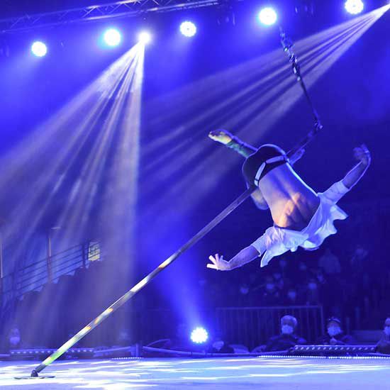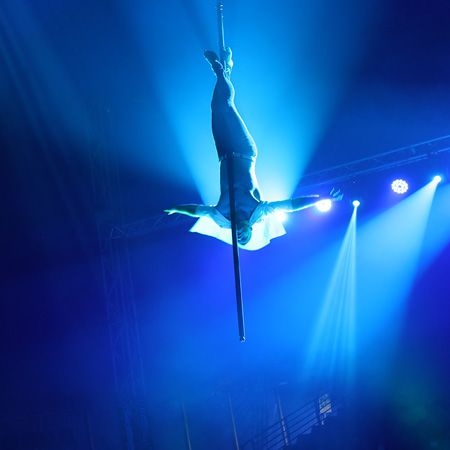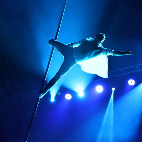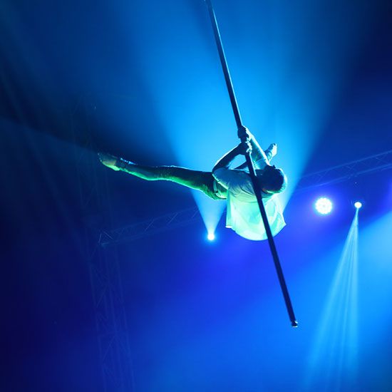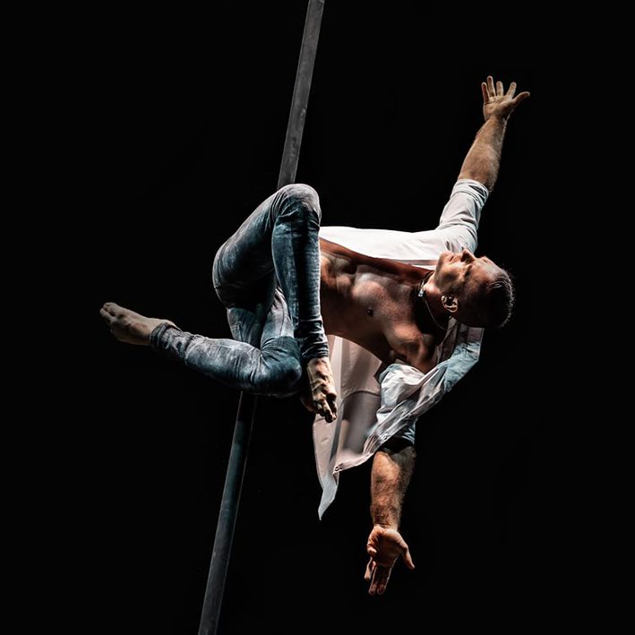 This exceptional aerialist executes daring and awe-inspiring acrobatic feats while swinging from an aerial pole.