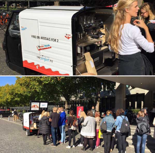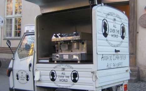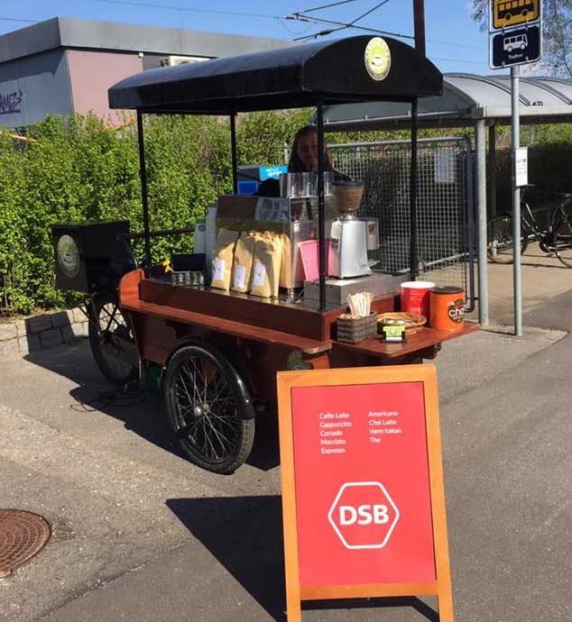 Our Copenhagen-based takeaway coffee cart is available for hire at events throughout Denmark. Choose from a variety of coffee event bikes, carts, scooters, and bars that can be customized for your next event. Branded cups can be used in promotional campaigns on every mobile coffee cart and hot drinks bike, with the option of full vinyl wrapping or branded banners being added to the pop-up barista services.