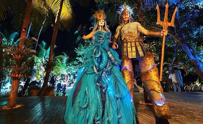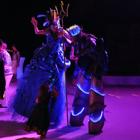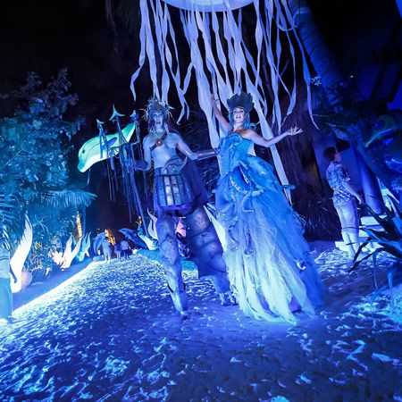 Depending on your event needs, you can book Poseidon and the Siren on stilts, with LEDs, or as captivating human statues.