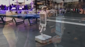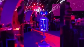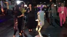 All actions of this interactive robot are manually controlled by an operator, including speech, from a distance that ensures guests do not notice. The benefit of having a human control this mobile photo robot is the ability to respond promptly, conversationally, and with a touch of humor. The cleverly designed interactive robot has a moving head and arms, and its eyes and eyebrows can be animated to give it human-like expressions.