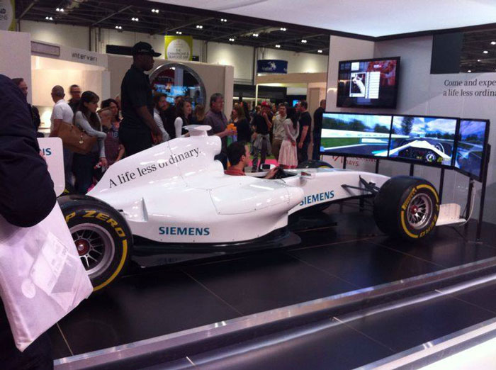 The racing car simulator can be booked as a full or half car can either have one or three 42" screens each and a spectator screen for the audience to see how the participants are getting along.
