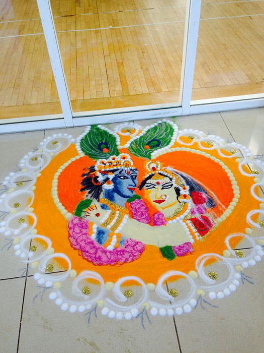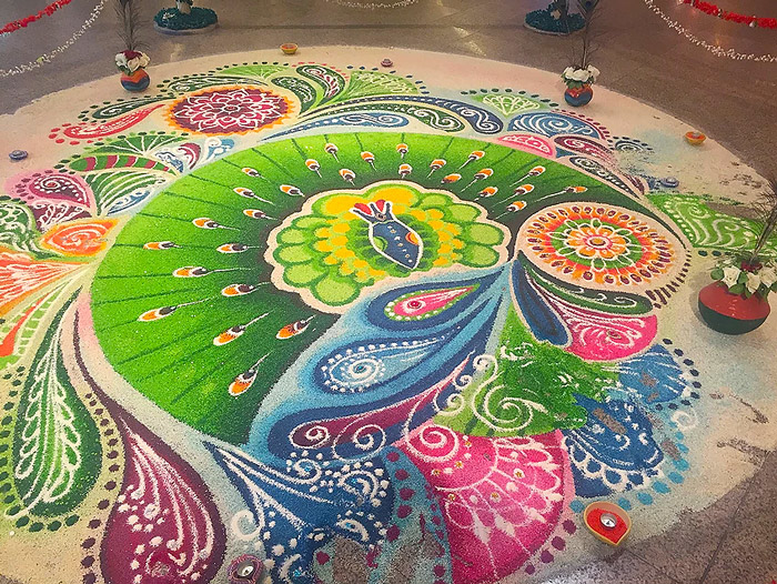 Our Rangoli Artist UK crafts his custom variations of this traditional art using non-toxic colored rice. He has developed the art form to offer fully personalized pieces for clients, including logos and specific color schemes, as well as large, eye-catching installations.