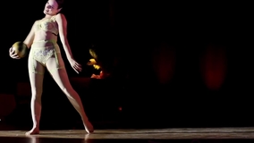 Her ground-based performance seamlessly blends acro dance with various props, including hula hoops, ball manipulation, jump ropes, and elegant ribbon dancing.