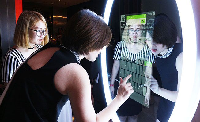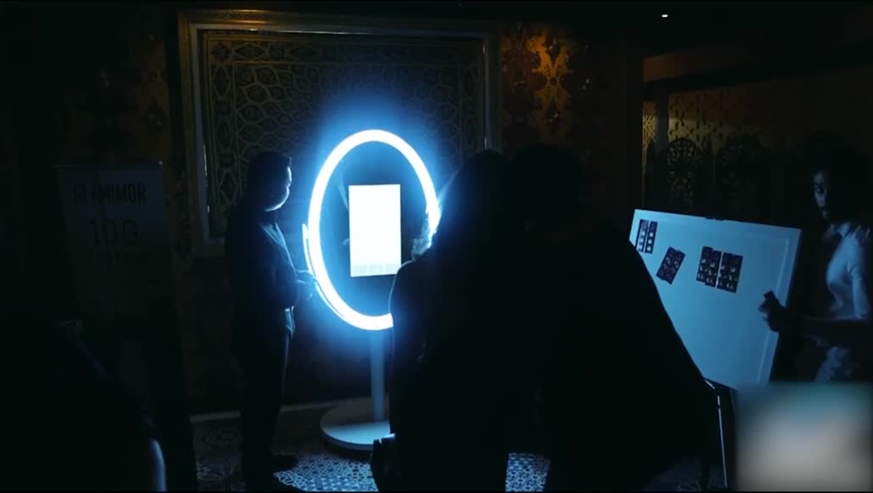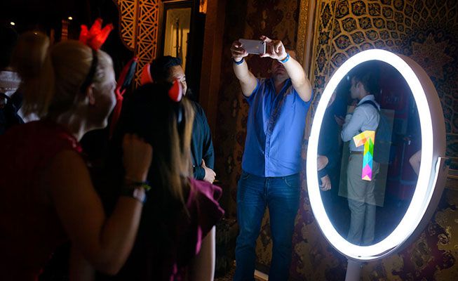 A versatile mirrored booth equipped with a DSLR camera, surrounded by an LED ring light to capture the perfect photo