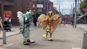 This charming bird duo, adorned in sequins, is a captivating walkaround act that delights in posing for photos and engaging with passersby.